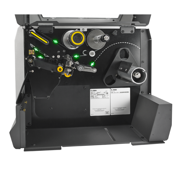 | Dostępne opcje | dwa otwarte gniazda komunikacyjne umożliwiające instalację wewnętrznych kart na interfejs 802.11ac, równoległy, Ethernet oraz aplikatora. Opcja IPv6 dostępna jest w postaci zewnętrznego klucza sprzętowego dołączanego do portu równoległego; nawijak; obcinak; wieszak podajnika nośników - o średnicy wewnętrznej rdzenia 24 mm; wrzeciono podające taśmy ze stroną z barwnikiem do wewnątrz; RFID; klawiatury z wyświetlaczem ZKDU™ do niezależnego drukowania |